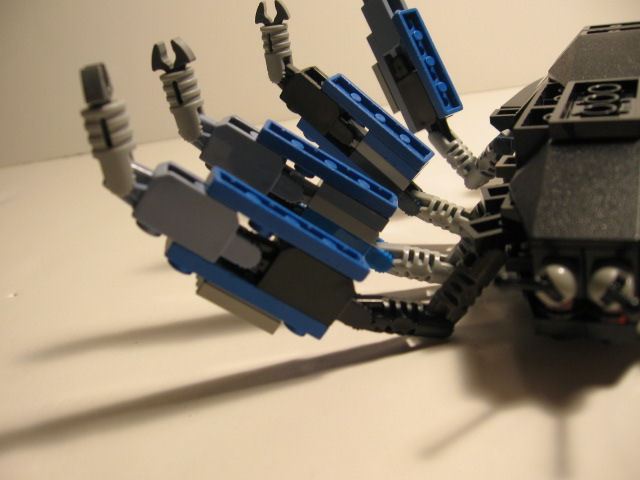 A more menacing angle of it. The legs had to be held together by those blue plates because I didn't have a 4x1 brick with the hinges on both sides in the right color, so I had to connect two 2x1s, causing there to be an extra joint which I didn't want.